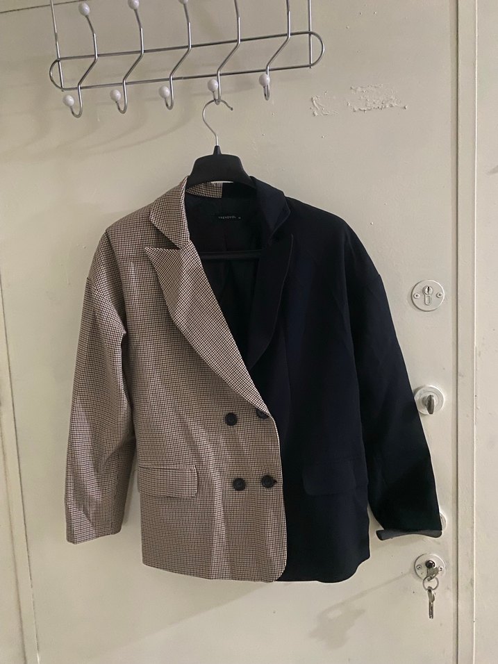 Kadın blazer, düğmeli ön ve yaka detayı ile bej kareli ve siyah renklerin birleşimiyle dikkat çekiyor. Uzun kollu, midi boyda, rahat kesimli ve sentetik kumaştan üretilmiştir. Ofis için trend sokak stili.