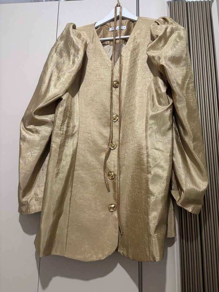 Düğmeli, uzun kollu, parlak altın renkli ceket. normal uzunlukta, notched yaka özel gün ve Ofis için uygundur.