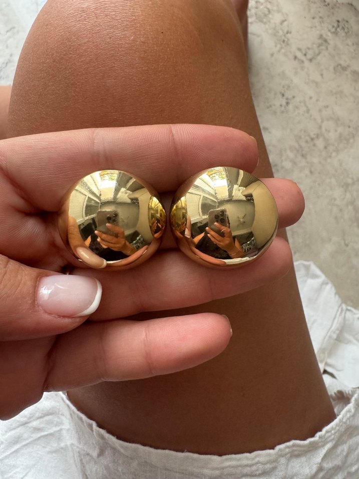 Minimalist ve desen içermeyen, düğmeli parlak altın küpeler, günlük kullanıma uygundur.✨