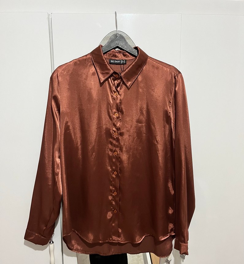 Parlak kahverengi, ipeksi kumaştan, düğmeli, uzun kollu ve yakalı, salaş kesim kadın gömleği. Normal midi boyda, ofis kullanımı için uygun. ✨