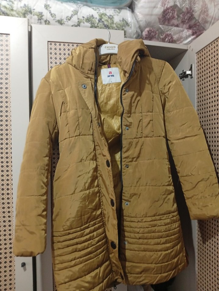 Düğmeli, parlak kahverengi kadın mont, notalı yaka ve uzun kolludur. Sentetik kumaştan midi boyda ve rahat kesimdir, günlük kullanım için uygundur.