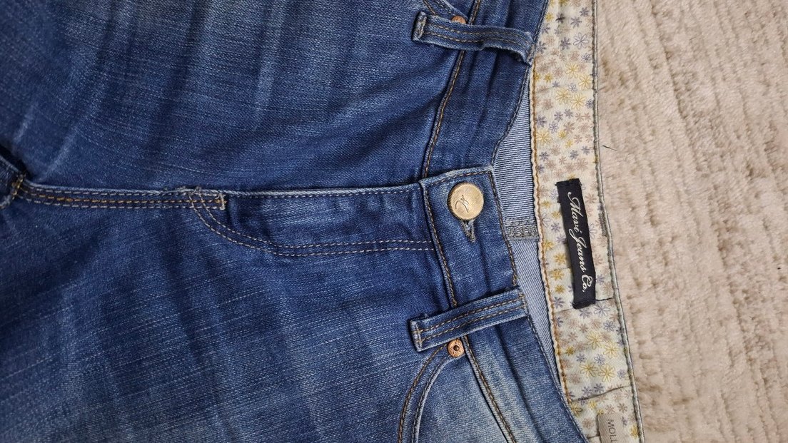 Düğmeli parlak mavi renk kadın kot pantolon, regular fit ve normal midi boyda, günlük rahat kullanım için uygundur.