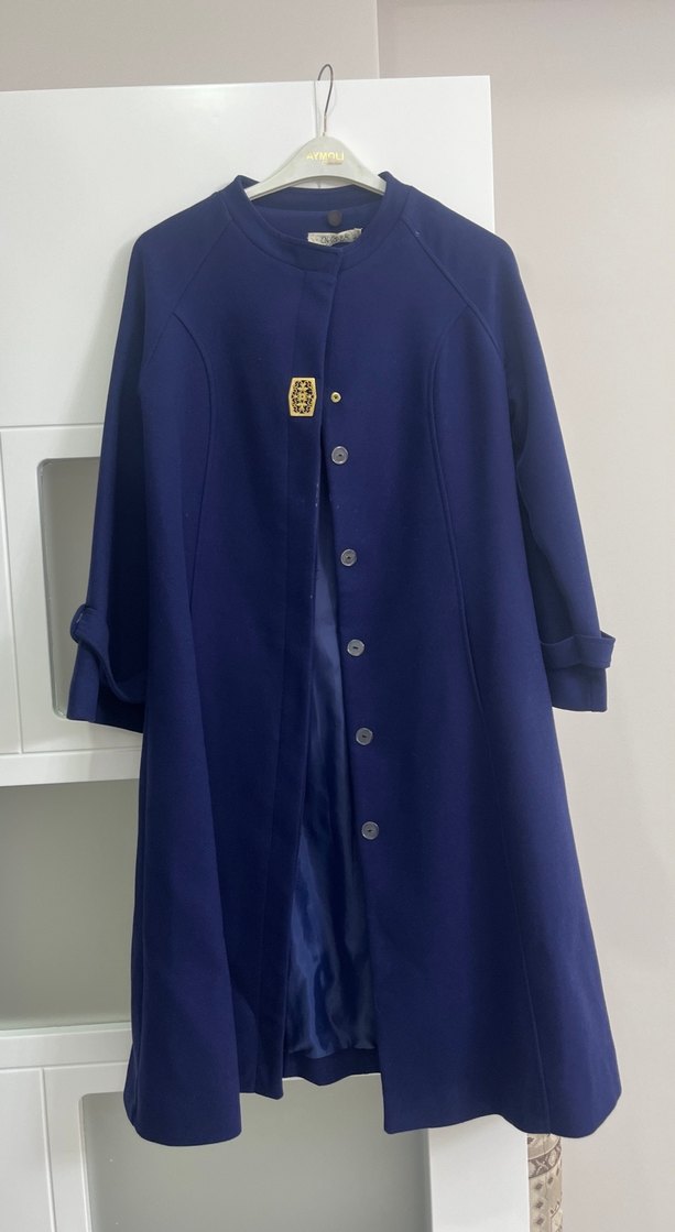 Düğmeli önü ve kesik yaka detaylı uzun mavi kadın kaban. Uzun kollu, regular fit ve yumuşak, parlak kumaştan üretilmiştir. Ofis için uygun, klasik Paris tarzı.