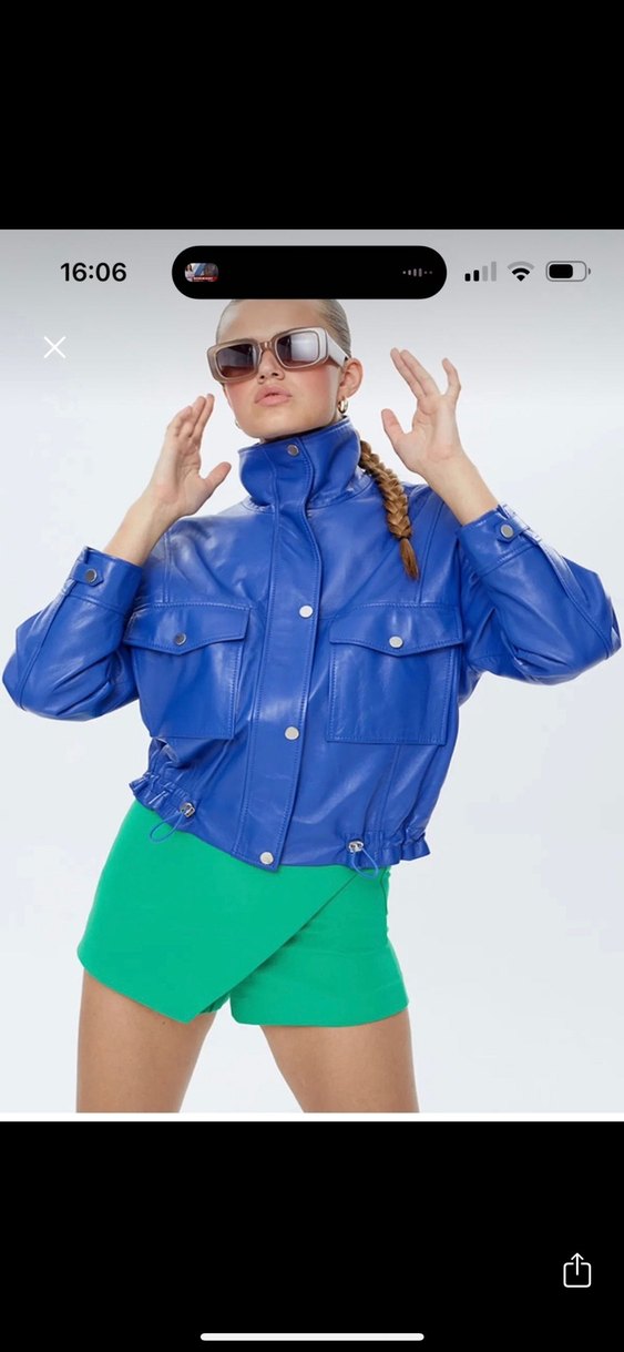 Bol kesim, kısa deri ceket yüksek yakalı ve düğmeli detaylara sahiptir. Parlak mavi rengi ve uzun kollarıyla günlük sokak stili için uygundur. ⏰ derimod