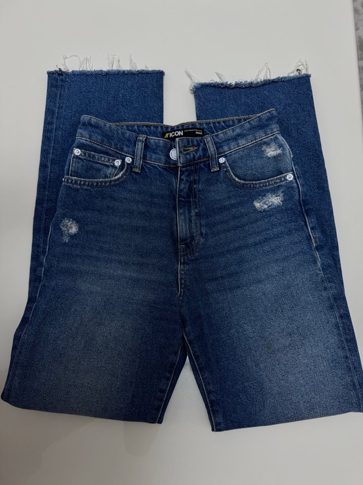 Düğmeli ön cep ve parlak mavi denim kumaştan midi boy, normal kesim ve hırpalanmış paça detaylı kadın jean.