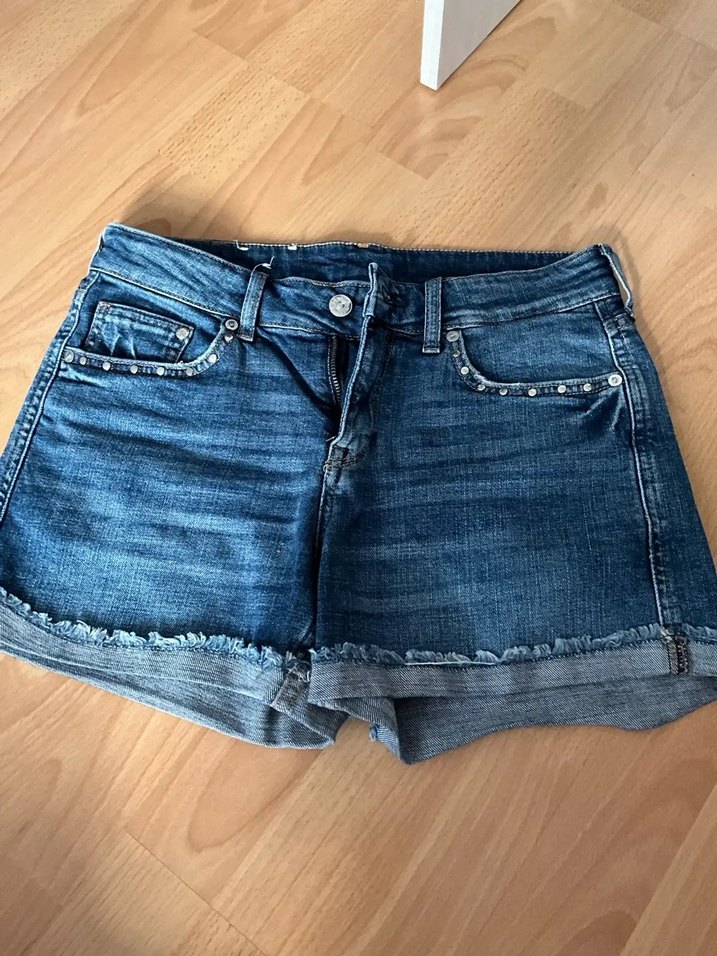 Düğmeli, ceplerinde metal detaylı, parlak mavi renkli, mini boy, dar kesim denim şort. Günlük kullanıma uygun normcore tarzda.