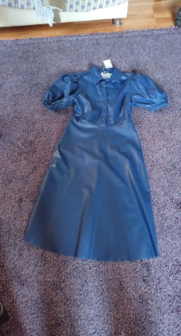 Düğmeli, yakalı ve kısa kollu, suni deriden üretilmiş, ofis için uygun, fitted kesim uzun kadın elbisesi.