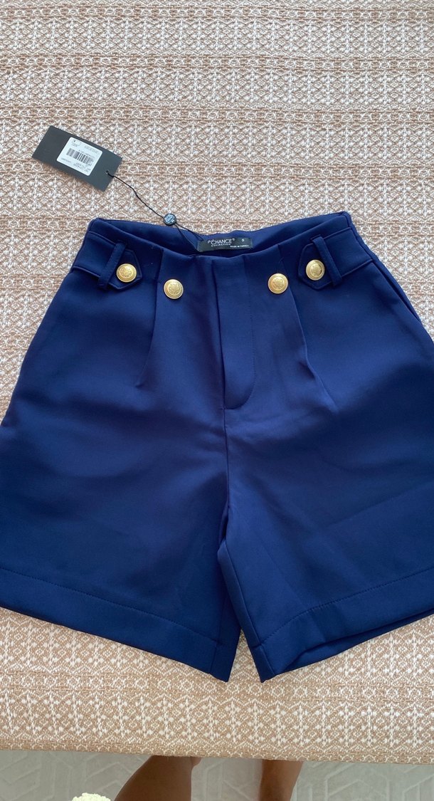 Düğmeli detaylara sahip parlak mavi yüksek bel kadın şort, düz ve rahat kesim, yumuşak sentetik kumaştan üretilmiştir.