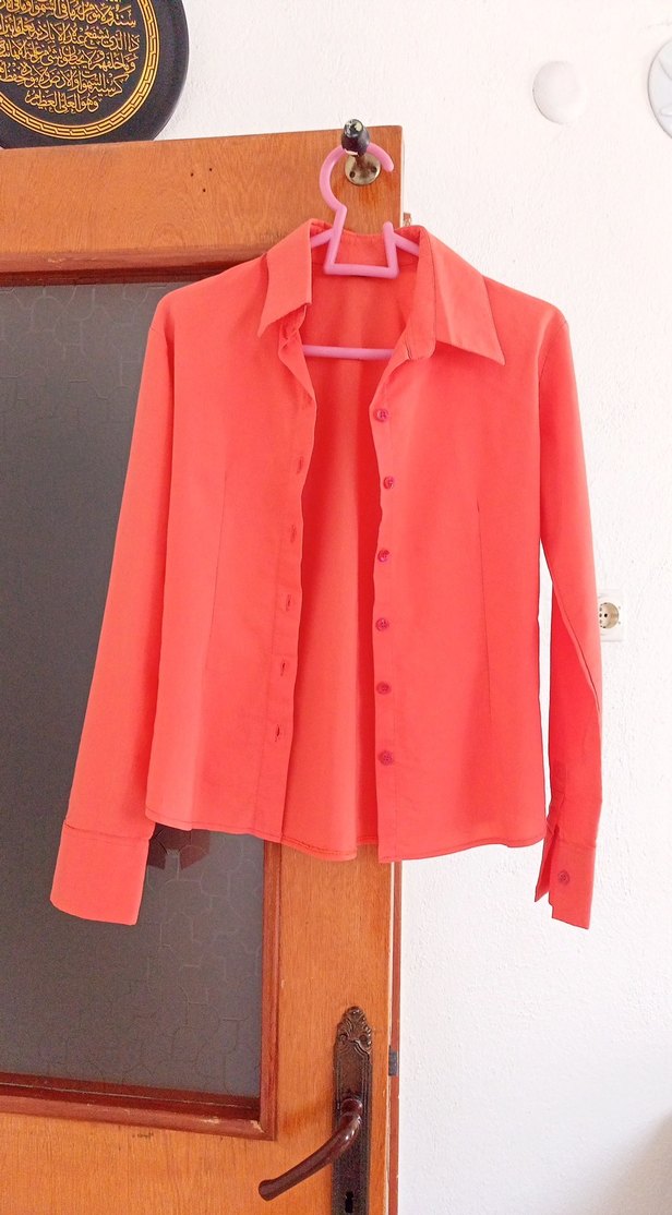 Düğmeli, yakalı, uzun kollu ve normal midi boyda nar çiçeği, ipeksi kumaştan kadın gömleği. Ofis için uygun, trend casual tarzda.