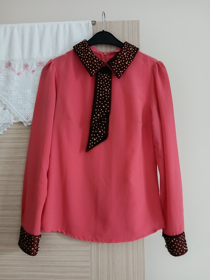 Düğmeli, yakalı ve parlak pembe renkte, ipeksi kumaştan uzun kollu bol kesim kadın gömleği. Manşet ve yaka koyu renk süslemelidir, normal boyda, ofis ve günlük kullanıma uygun.yeni giyilmedi