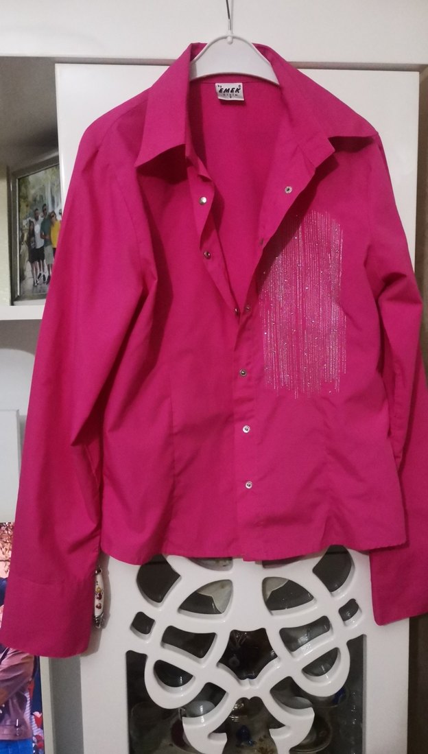 Parlak pembe renkte, düğmeli ve uzun kollu kadın gömleği. Notch yakalı, bol kesim ve baskılı desenli, sentetik kumaştan üretilmiştir.