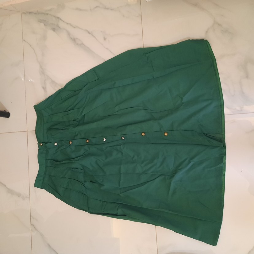 Parlak yeşil renkte, düğmeli ve bol kesim uzun kadın eteği. Sentetik kumaştan olup minimalist bohem tarzındadır. Açık hava kullanımı için uygundur.