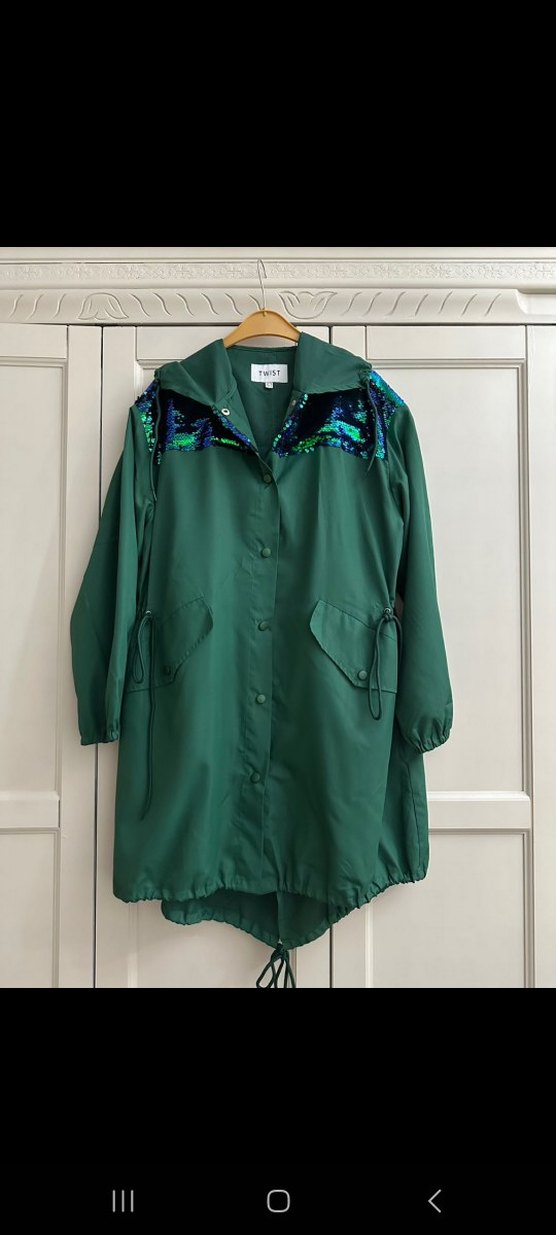 Düğmeli, uzun ve bol kesim yeşil yağmurluk. Uzun kollu, sentetik kumaştan, yakasında parlak nakış detayları bulunur. Günlük ve sokak stiline uygundur. ️