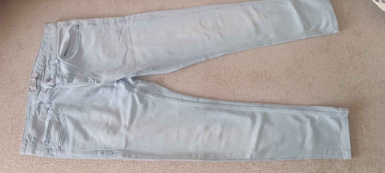 Düğmeli ön kısmı olan, normal midi boyda, sade ve günlük kullanıma uygun bej renkli fitted kot pantolon.