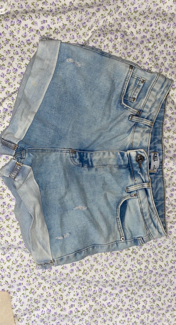Düğmeli, bol kesim ve bağlamalı desenli pastel mavi denim kadın mini şort, günlük rahat kullanıma uygun.