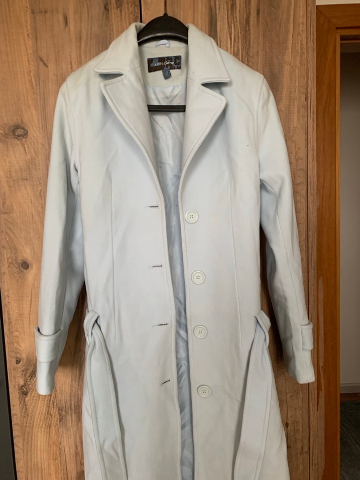 Bı senenin moda rengi, Düğmeli kapamalı, kemerli uzun kollu pastel mavi parsedü Yumuşak ve pürüzsüz kumaştan, klasik yaka ve yan cepler bulunur. Bir iki kere kullanıldı ancak, Askıda çok beklediği içün kuru temizleme gerekli