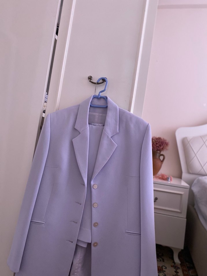 Düğmeli ön kısmı, normal boy ve regular fit kesimiyle pastel mor renkte erkek takım elbisesi. Ofis için klasik ve sade bir şıklık sunar. Strappy kolludur. ️42 beden ama 36-38 bedene de uyumlu