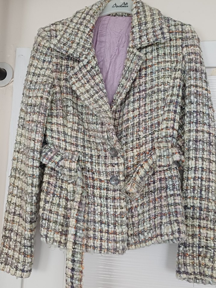 Düğmeli, notalı yakalı, pastel çok renkli dokulu kumaştan yapılmış kadın ceket. Uzun kollu, midi boy ve ofis kullanımı için uygun.
