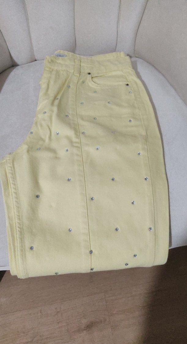 Düğmeli ön kısmı taşlı, paça yırtmaçlı ve regular kesimiyle pastel sarı midi kot pantolon. Yumuşak sentetik kumaştan, gündelik kullanıma uygun normcore tarzında, küçük taşlarla süslenmiştir.