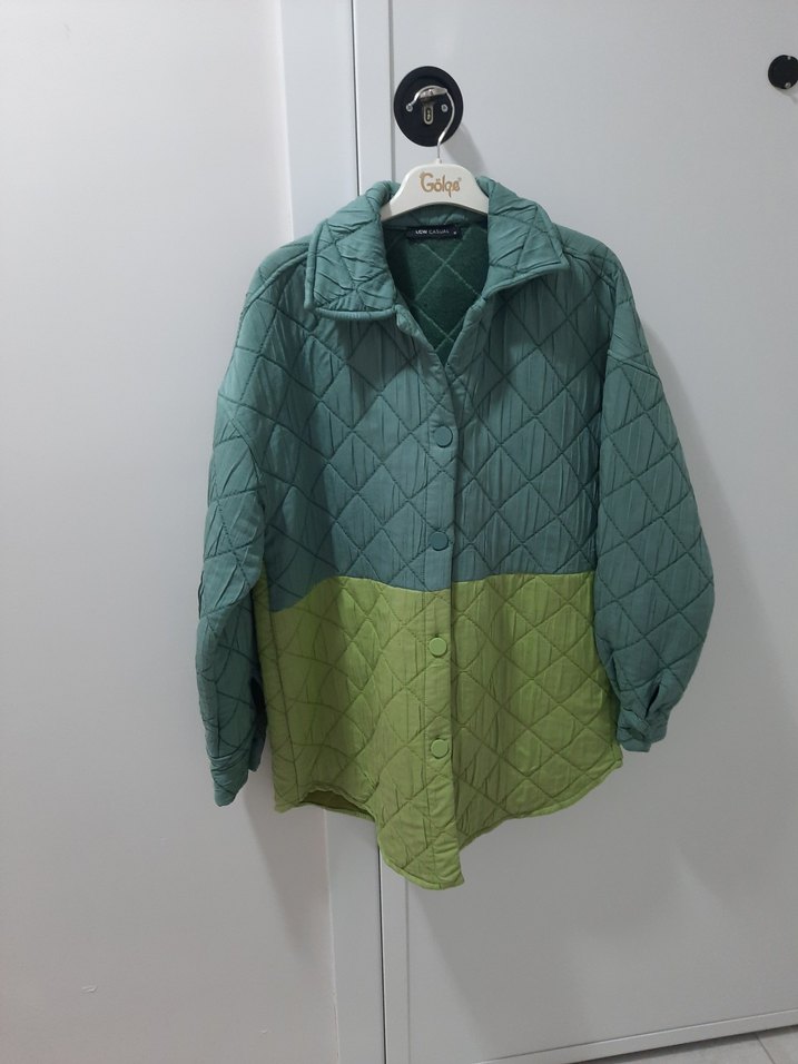 Bu kadın ceketi, düğmeli ön kısmı, uzun kollu ve kesik yakası ile gevşek bir kesime sahiptir. Pastel yeşil renk bloklu, yumuşak sentetik kumaştan yapılmıştır ve günlük kullanım için uygundur.
