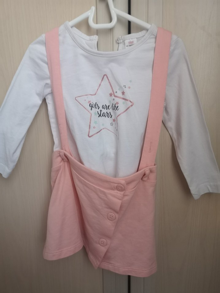 Pembe pamuklu, fit kız elbise, askılı ve yuvarlak yaka. Baskılı yıldız ve düğme detaylarıyla trendy günlük stil için uygun.