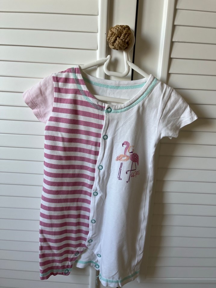 Düğmeli, pastel pembe renkli, baskılı ve kısa kollu bebek tulumu, kolay giydirme için önden düğmelidir.