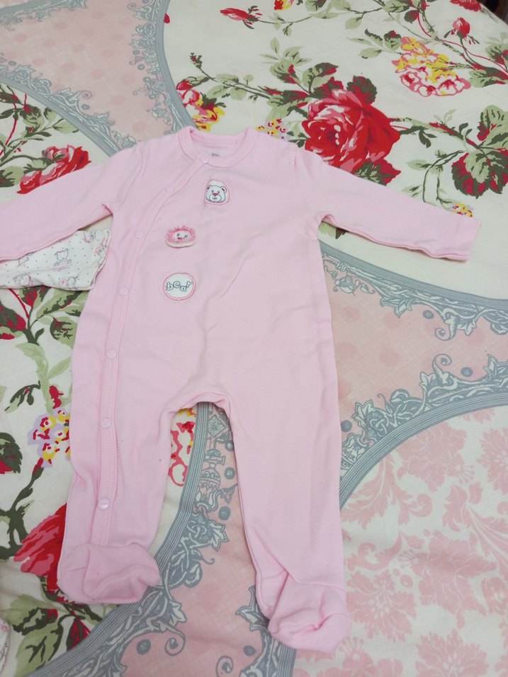 Düğmeli, baskılı detaylara sahip pastel pembe bebek kız tulumu. Uzun kollu ve ayaklıdır. ikili fiyatıdır küçük geldiği için satıyorum