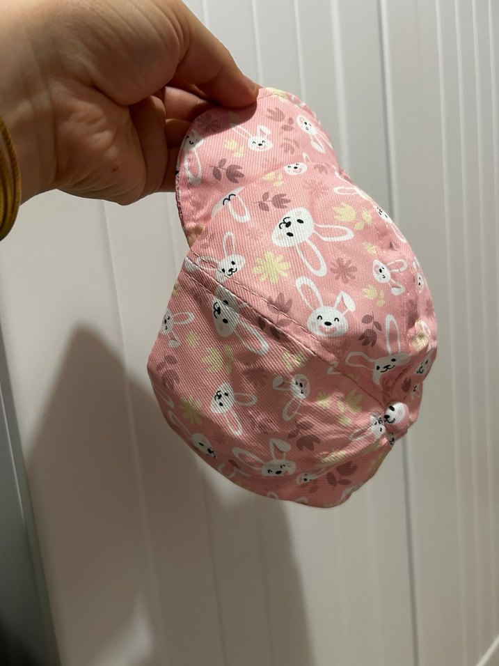 Pembe renkli, düğmeli ve baskılı tavşan desenli bebek şapkası. Sentetik kumaştan yapılmış, bohem ve retro tarzına uygundur. 6-9 ay ve bikaç daha takılabilir