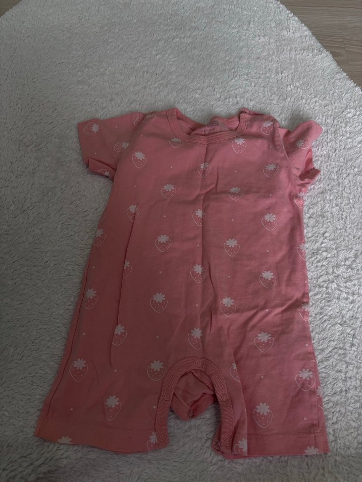 Pastel pembe renkli, kısa kollu ve düğmeli bebek kız tulumu. Hafif çilek desenleri bulunur.