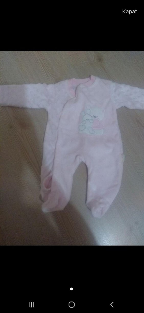 Düğmeli, pastel pembe renkte, nakışlı desenli yumuşak kumaştan bebek kız tulumu.