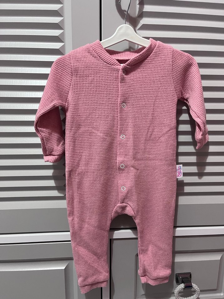 Yumuşak dokulu, düğmeli pembe bebek tulumu, uzun kollu ve rahat kullanım için uygundur.