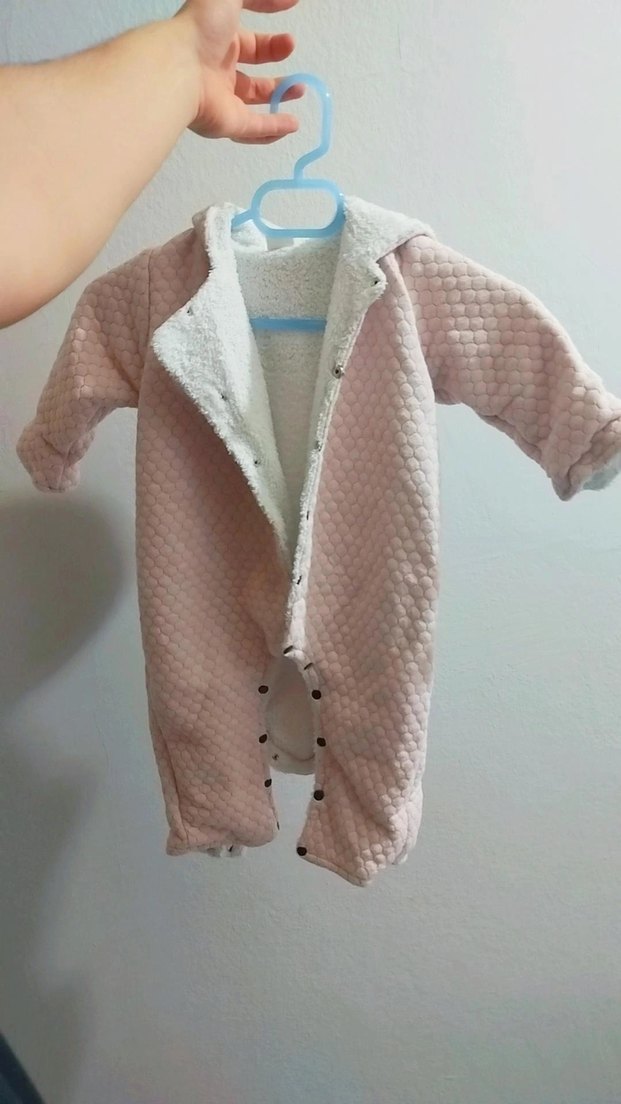 Hafifimsi pembe renkte, düğmeli yaka detaylı bebek tulumu. Yumuşak ve sıcak kumaştan üretilmiştir. ❄️