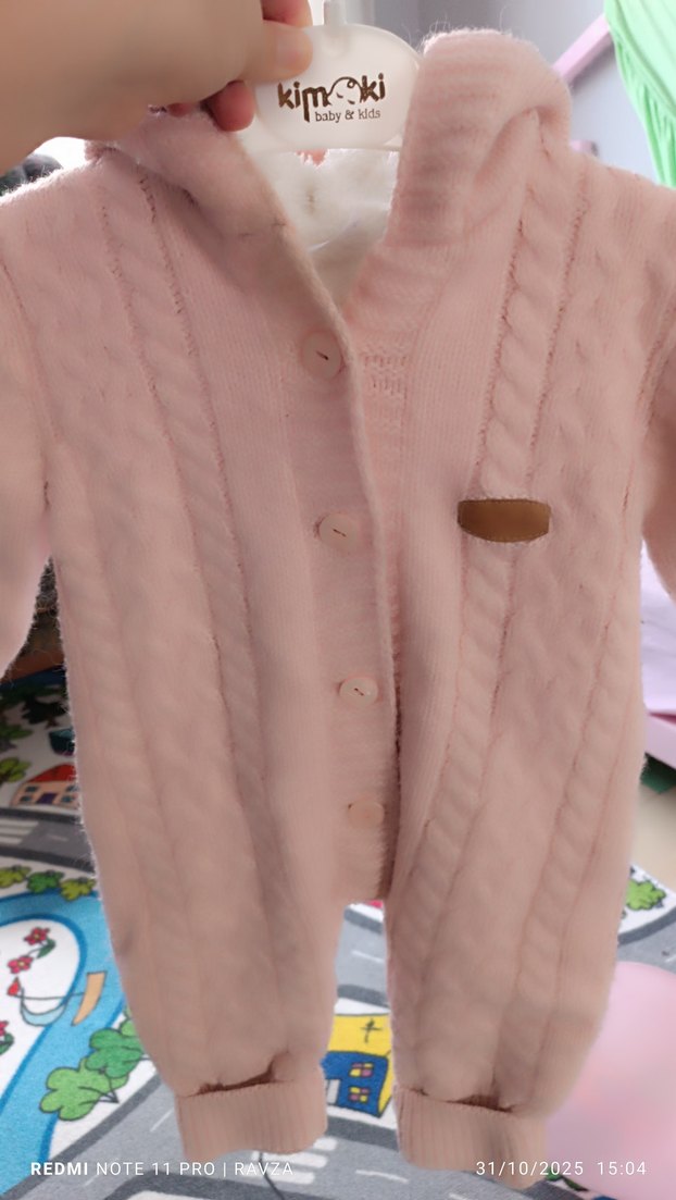 Pastel pembe renkte, düğmeli ve yakalı bebek tulum az kullanıldı temiz sorunsuz sıcacık tutuyor içi yünlü severek kullandığım ürün küçük geliyor kızıma oyuzden satıyorum