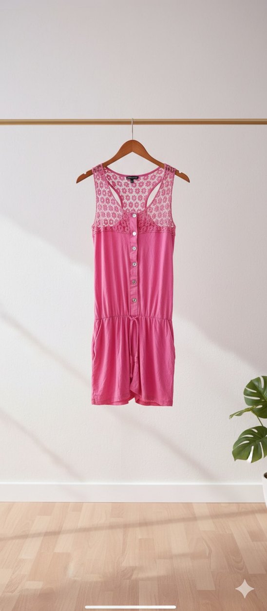 Kolsuz, V yakalı pembe tulum, düğmeli ön kısmı ve yumuşak örme kumaşı ile bohem tarzda rahat ve şık bir görünüm sunar.