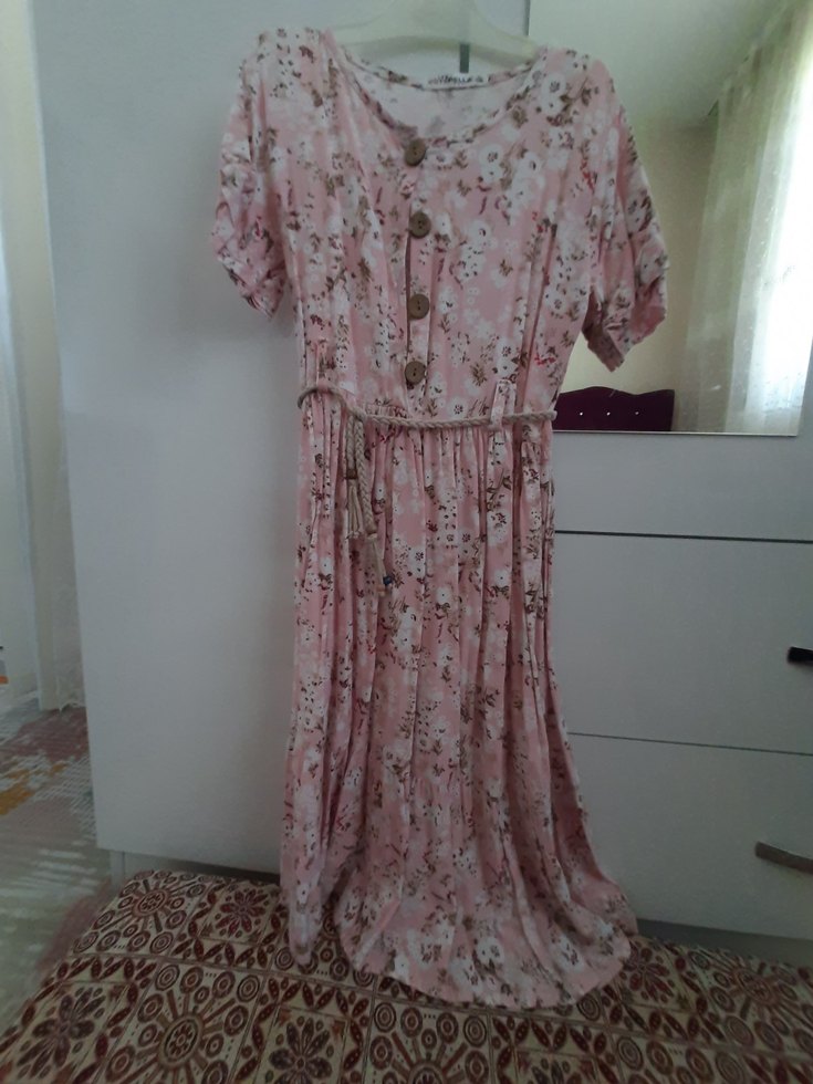 Düğmeli, V yakalı, pamuklu pembe bohem uzun elbise. Pastel tie-dye desenli, salaş kesim ve askılı kolludur. Günlük kullanıma uygundur.