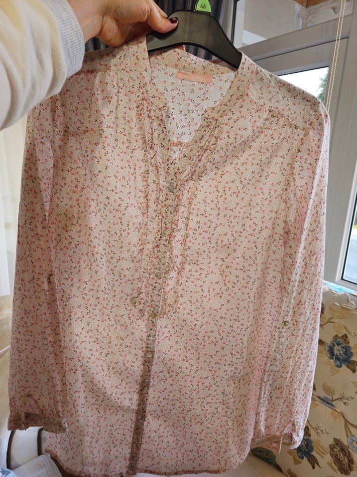Pamuklu, düğmeli, uzun kollu, V yakalı, bol kesim, pastel pembe, vintage desenli bluz. Günlük kullanıma uygundur. 42 beden 44 te olur