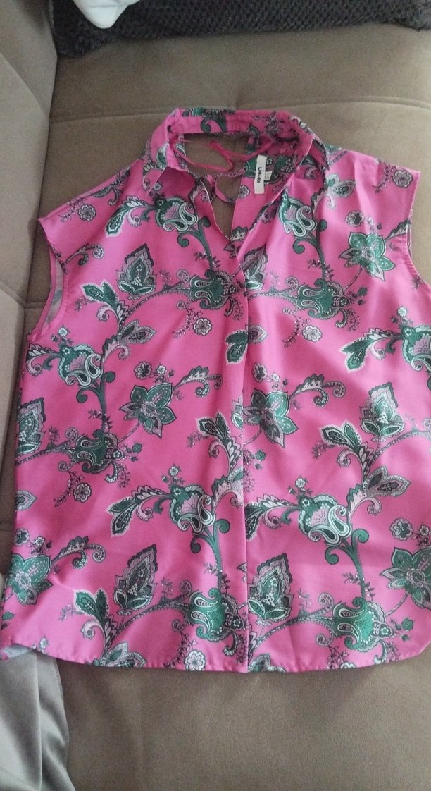 Pembe çiçekli baskılı, kolsuz, düğmeli ve yakalı gömlek. Rahat kalıp ve sentetik kumaştan, bohem tarz için uygun.