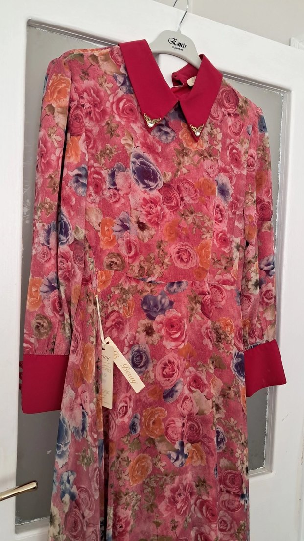 Düğmeli, uzun kollu, bol kesim pembe çiçek desenli vintage tarzda bohem elbise. V yakalı, düğme detaylı, düğün için uygun. Şifon elbise Dar kesim 44 beden gibi