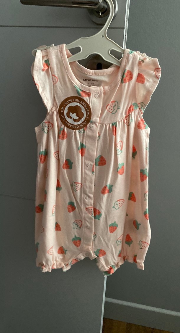 Düğmeli, pembe pastel renkte ve çilek desenli bebek tulumu. Yumuşak, organik pamuk kumaştan üretilmiştir. 6-9
