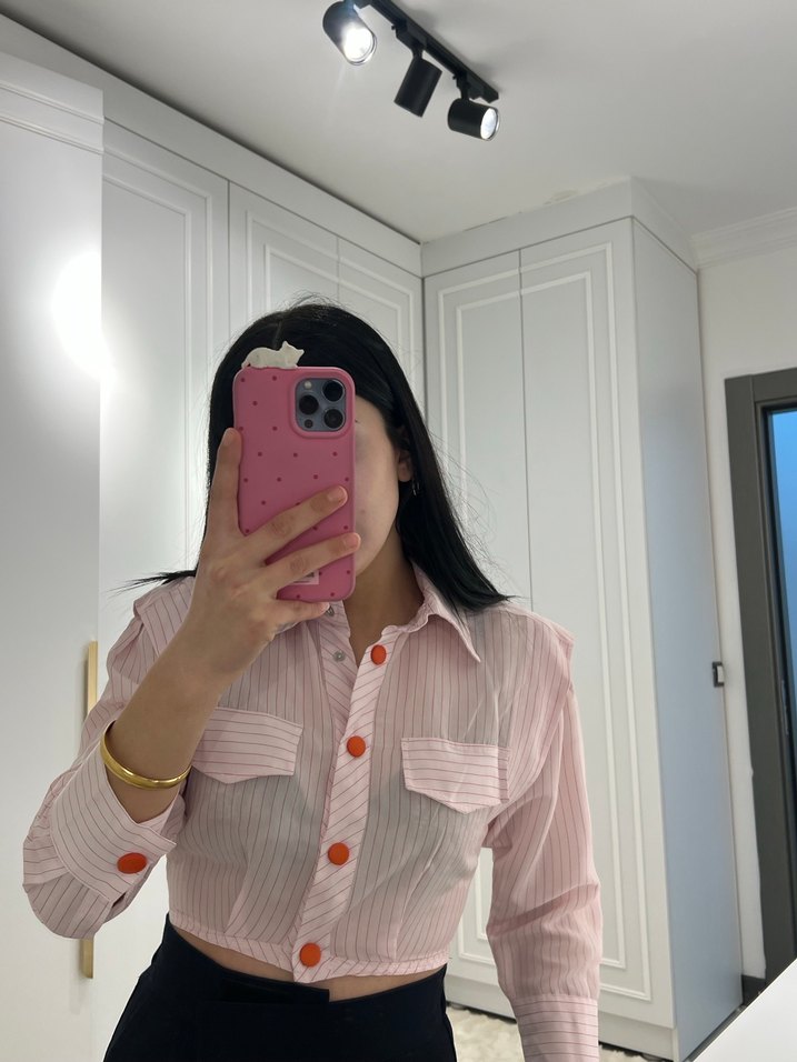Düğmeli, uzun kollu ve yakalı bu gömlek, sentetik kumaştan yapılmıştır. Pastel pembe çizgili desene sahip, günlük sokak stiline uygundur.