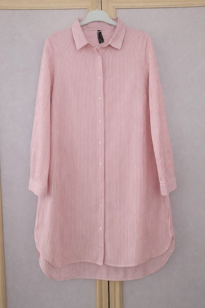 Pembe çizgili bu tunik uzun kollu, düğmeli ve kayık yaka detaylarına sahiptir. Rahat kesimi ve midi boyu ile yumuşak kumaştan üretilmiştir. Göğüs 51 Boy 90