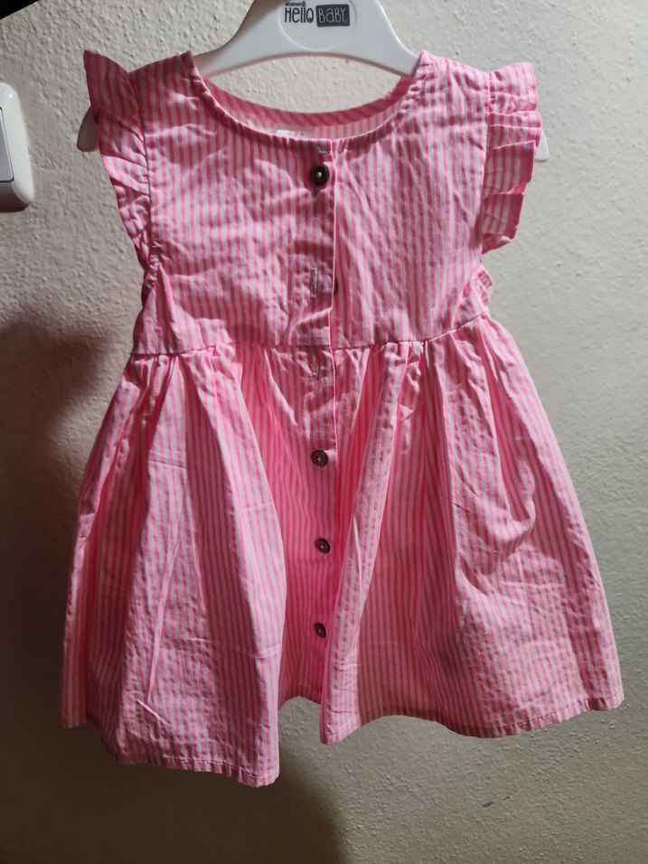 Pamuklu, düğmeli, kolsuz, straplez yakalı ve bol kesim pembe çizgili kız elbisesi. Sokak stiliyle uyumludur. Hiç kullanılmadı, etiketi yırtıldı