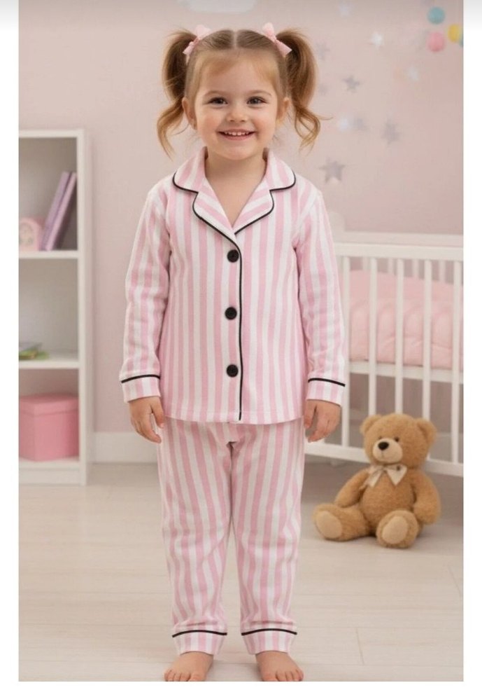 Düğmeli ön, uzun kollu ve notalı yakalı kız pijama takımı. Yumuşak ve sıcak fleece kumaştan, pastel pembe ve beyaz çizgili.