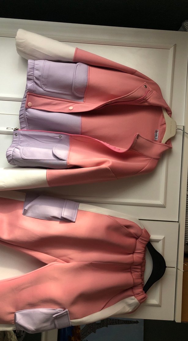 Çocuk eşofman takımı, düğmeli ön ve kısa kesim, pastel pembe ve lavanta renkleriyle. Sentetik kumaştan,kesik yaka detaylıdır. Fermuarlı ve düğmeli cepli takım