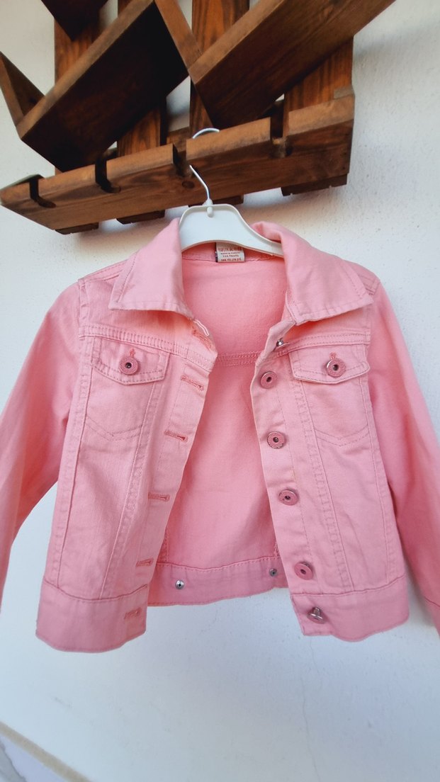 Düğmeli önü ve kesik yakası olan, pastel pembe renkte, fitted kesimde denim kız ceketi. Sokak modasına uygun desen içermeyen sade tasarım.düğmelerde soyulmalar var.