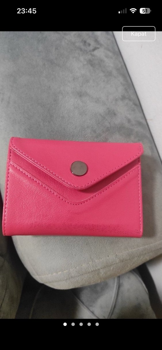 Pastel pembe deri kadın cüzdanı, düğmeli kapama ve minimal desensiz tasarıma sahiptir, günlük kullanım için uygundur. Sıfır Üründür İç lekesi kağıt lekesidir.