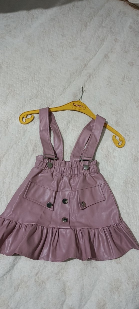 Düğmeli ve bağlama desenli, pembe deri kız elbisesi. Askılı ve rahat kesimli, günlük sokak stili için uygundur.