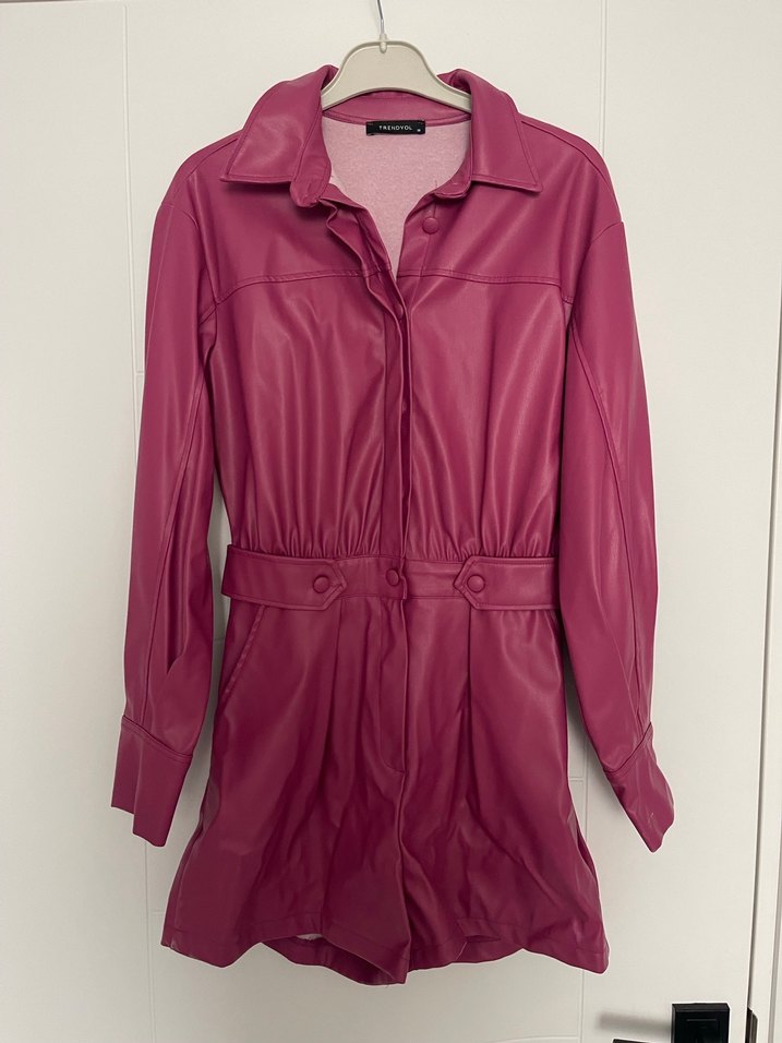 Düğmeli, uzun kollu, pembe parlak deri kadın tulum kısa. Notlu yaka ve vücuda oturan kesimiyle sokak modasına uygun. 34-36 beden