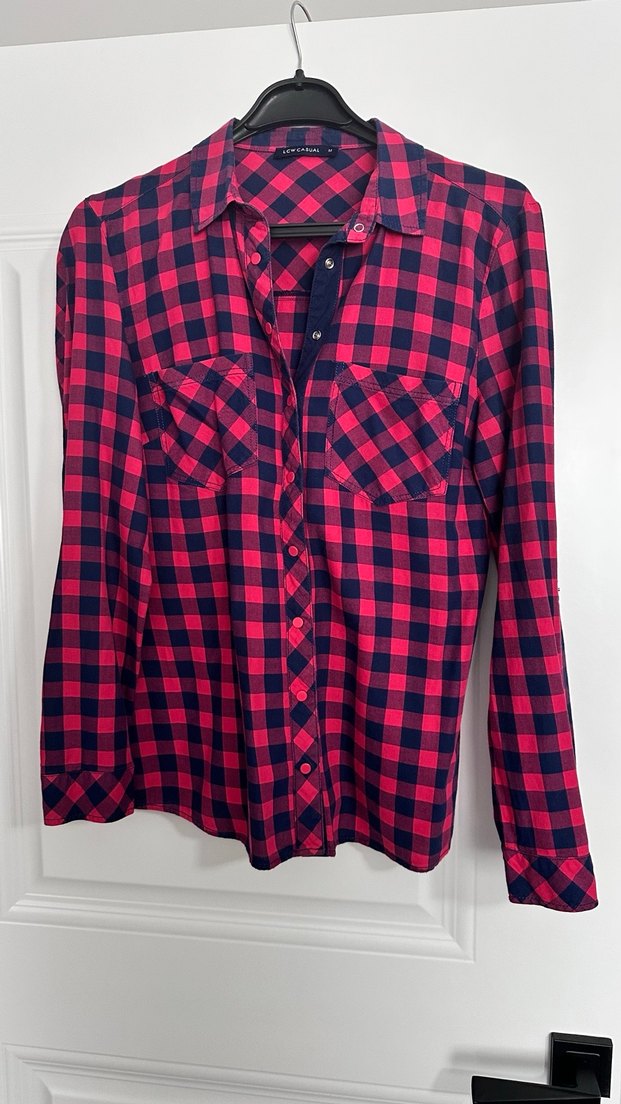 Düğmeli, uzun kollu, koyu pembe ekose desenli kadın gömlek. Rahat kesim ve tekstil kumaştan, günlük kullanıma uygun. M beden