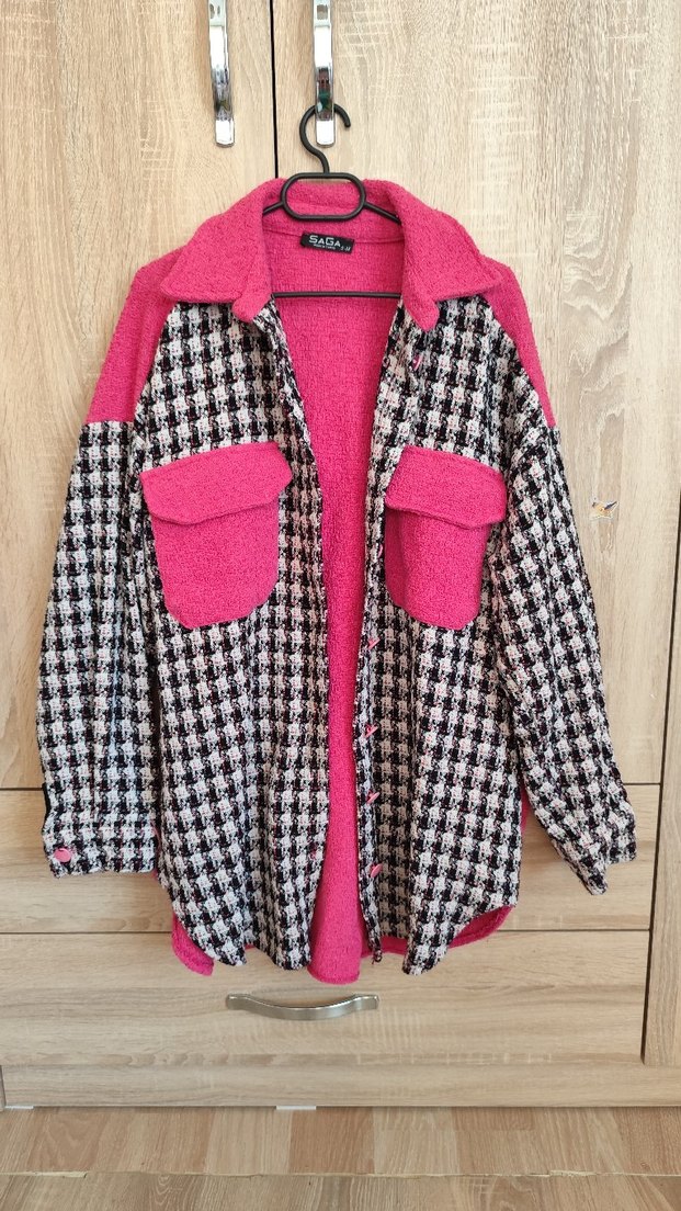 Düğmeli, uzun kollu, notched lapel yakalı kadın gömlek. Gevşek kesim, koyu pembe ekose desenli, yumuşak ve sıcak kumaştan. Ön cepleriyle günlük kullanıma uygun. kadın gömlek ceket az kullanıldı kusuru yok marka temsili